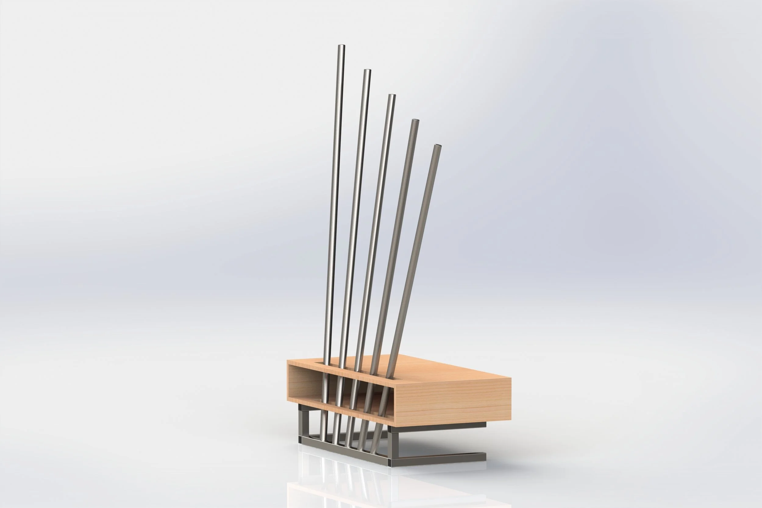 A coat rack designed for the office lobby. The metal frame features five posts, each a different height, canted forward to hang coats on, while the table below has room to store shoes and lay out gloves and other accessories to dry.