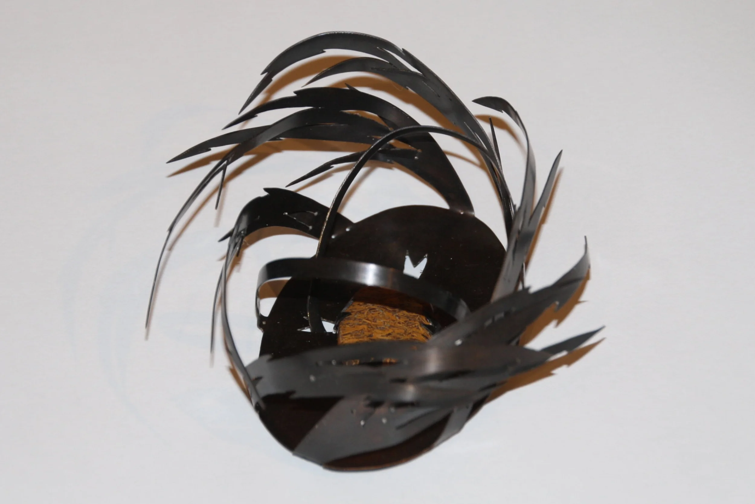 Made as a gift for my mother, Nest is meant to evoke the feeling of maternal protection. Hand cut from a single sheet of copper, Nest has been bent to form its distinctive shape. A colorful oval stone has been set into the center of Nest's protective arms.