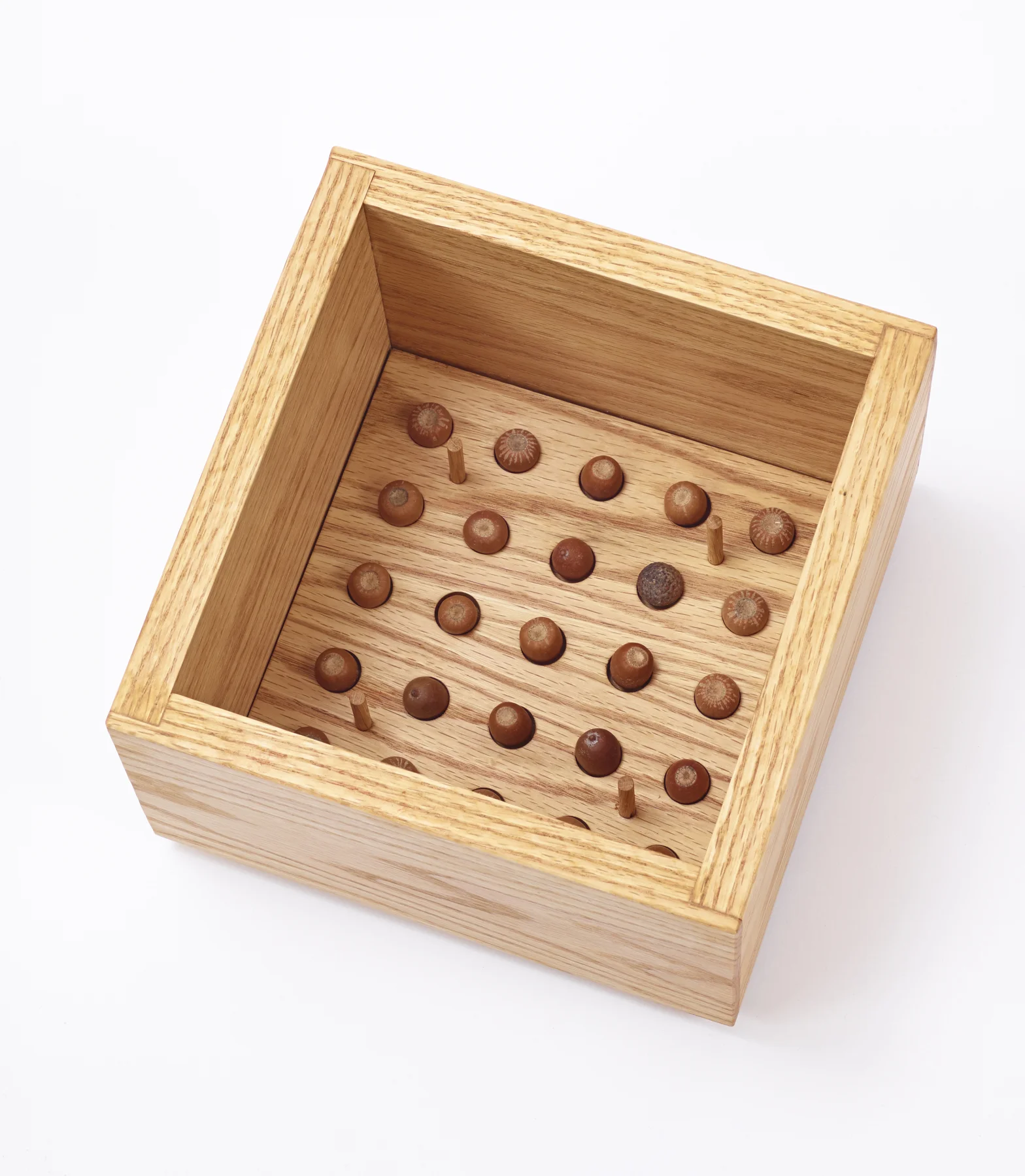 Inserted into the bottom of the box, twenty-five acorns await planting. Upon disposal, Phoenix will birth new oak trees to replenish the life used in its creation.