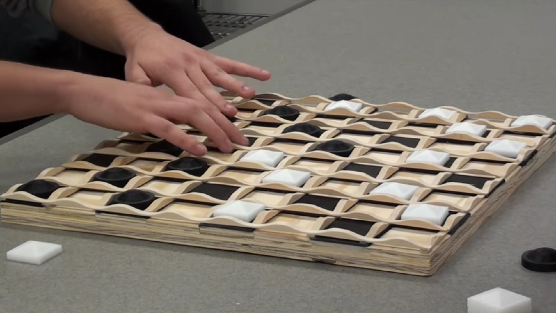 The checkers pieces received a radical redesign for Tac-Tiles. The idea was to makes them as different as possible, using color, shape, and feel. The black piece is a bit larger and features a pyramidal top and harsher edges, whereas the red piece is circular, with a domed top and softer edges. Both have concave bottoms that allow them to be fitted onto like pieces in the event that one is kinged.
