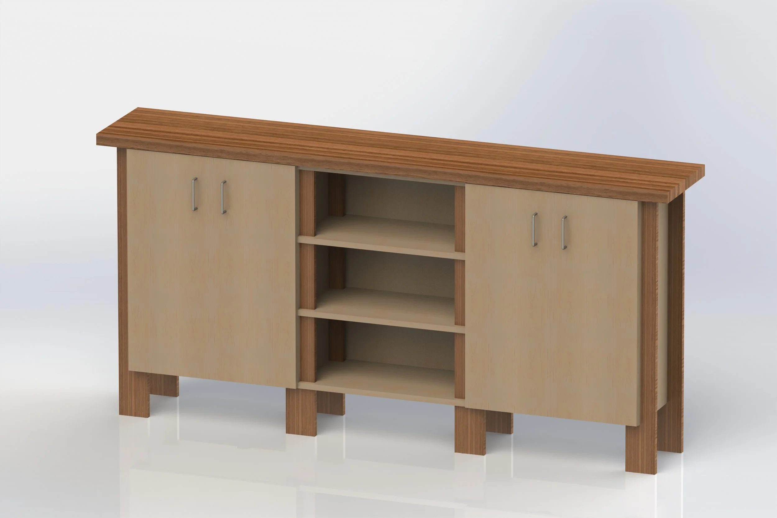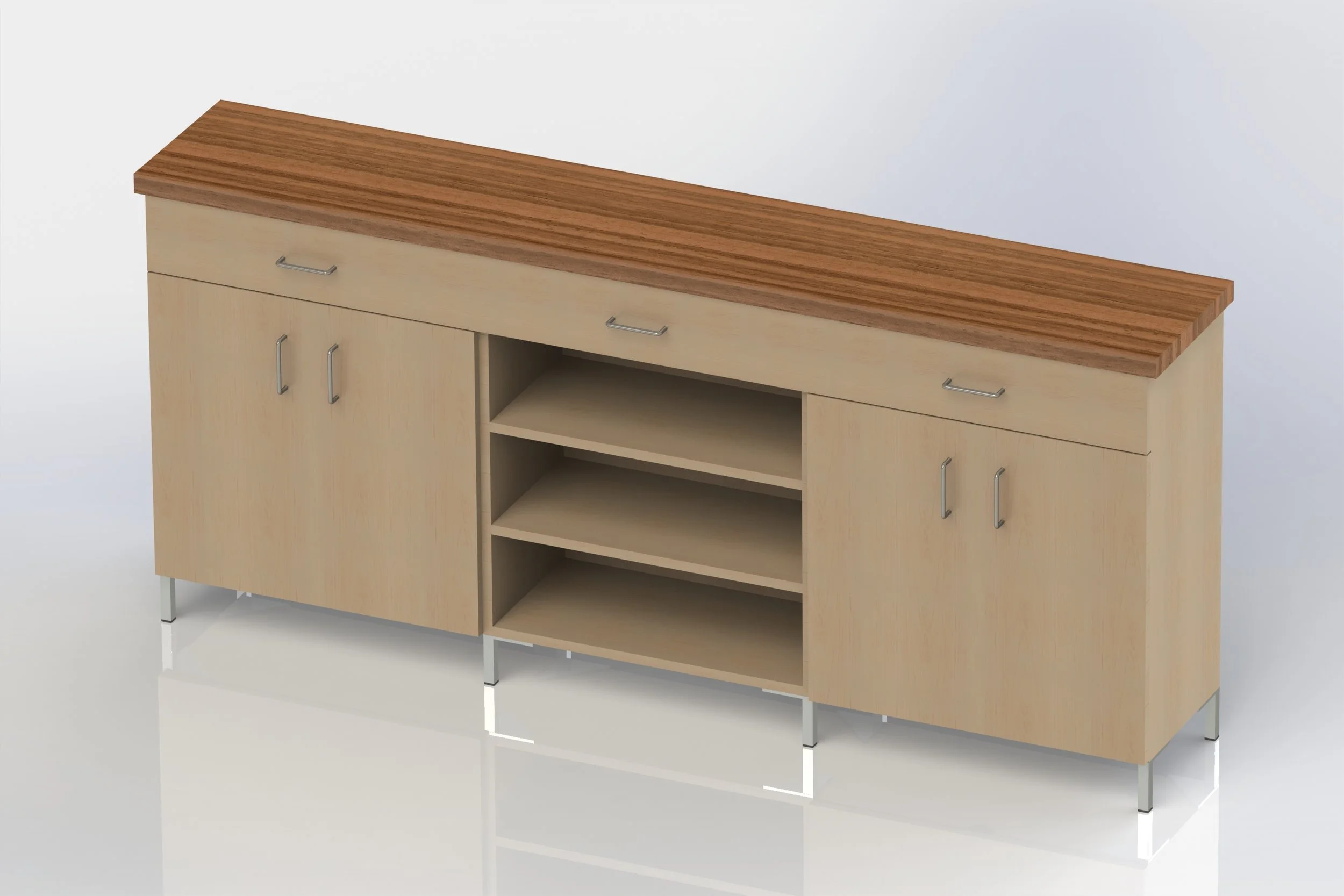 A maple buffet and matching conference table for the Wings Financial board room. This design went through multiple iterations based on customer feedback. Solidworks renderings were a valuable tool to communicate with the customer on what functions they were looking for and what they wanted stylistically.